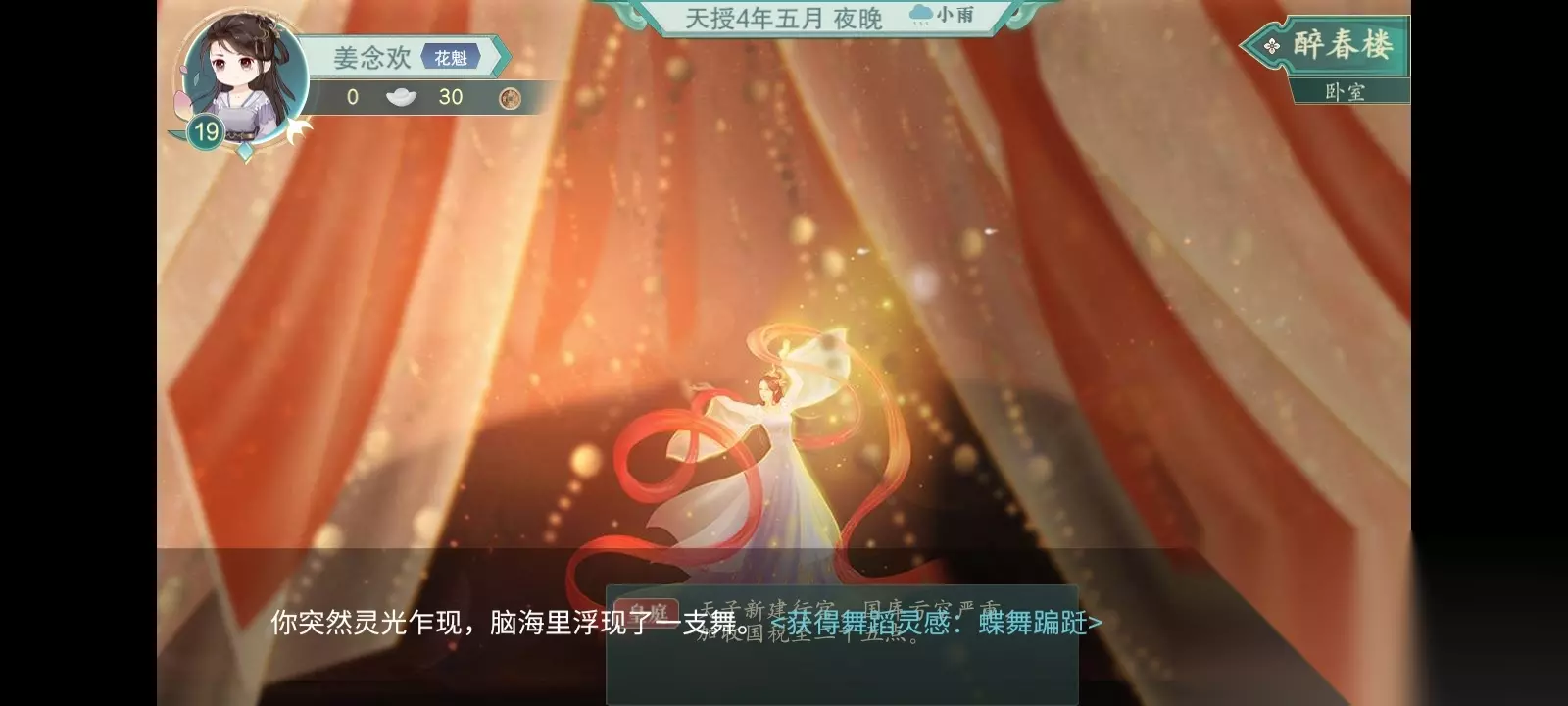 古时候人生模拟器花魁线结果攻略 一、 1、游戏玩家首先前去醉春楼,挑选看到别人登台,一直回挡到发生跳舞设计灵感。