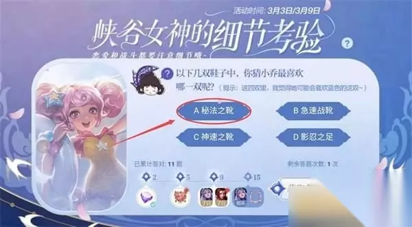 《王者荣耀》女神的细节考验第十二题答案一览 问题:以下几双鞋子中,你猜小乔最喜欢哪一双呢? (提示:这四双里,我觉得她可能会喜欢蓝色的这双~) A、秘法之靴 B、急速战靴 C、神速之靴 D、影忍之足 答案:A、秘法之靴