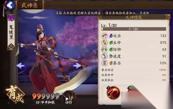 队伍搭配: 山兔/镰鼬,加快起手并增加攻击力是输出类式神最喜欢的东西。 AOE型输出,(使用【破势】时) AOE输出降低对方群体的血量后,有利于小黑进行斩杀。 克制式神: 九命喵/骨女/吸血姬 这些自残复活型的式神,通常血量会处于一个危险值,有利于小黑被动的触发。 被克制式神: 控制型式神 控制型式神是所有输出类式神的天敌。