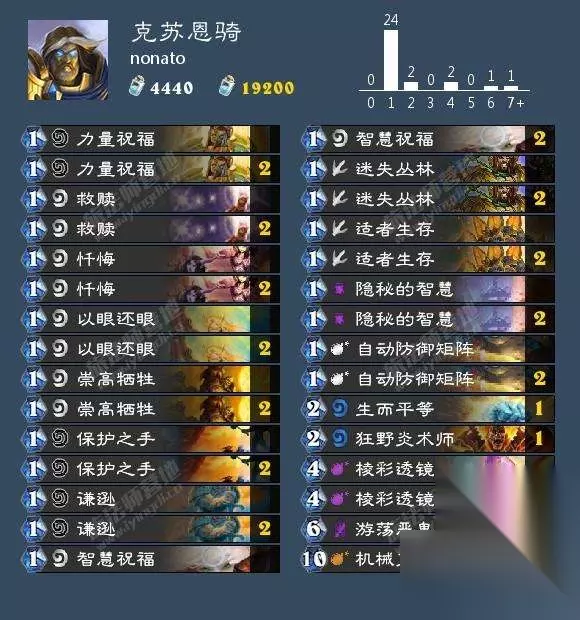 从卡组中可以看出,这是一套极具想象力的克苏恩骑,一共带了24张1费法术,剩下6张都是OTK组件牌。 单卡分析: