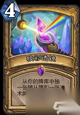 这张牌是克苏恩骑卡组的核心,因为卡组里只带了克苏恩、炎术士、恶鬼这三张随从,其它全是一费法术,所以说只要有一张随从上手,便可以使用棱彩透镜,将剩下的机械克苏恩或者恶鬼过到手牌,并且变为一费,为后面的OTK做铺垫。