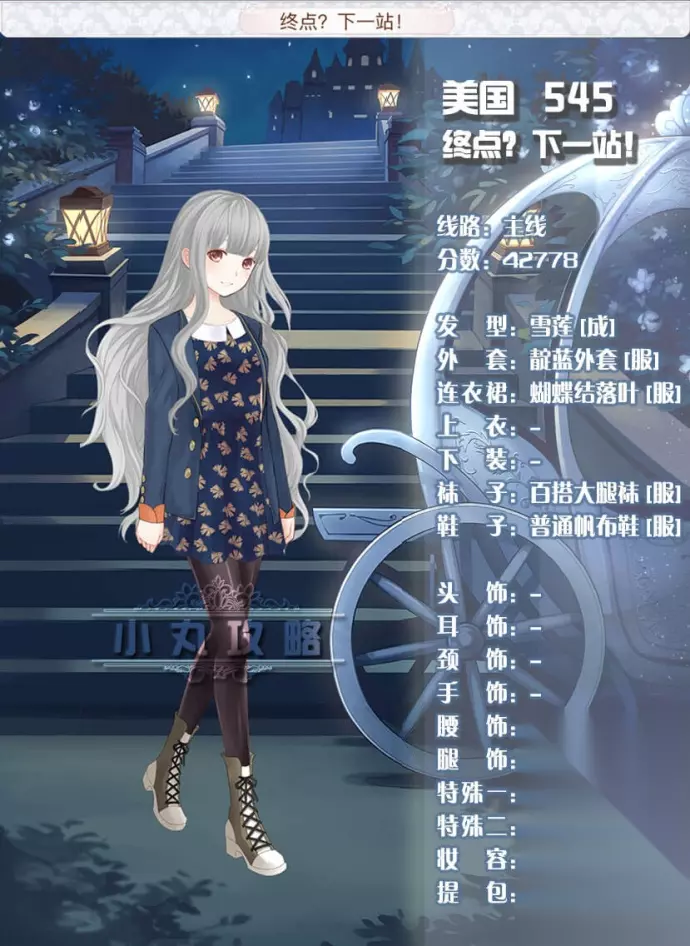 本文为《暖暖环游世界》玩家带来美国545终点?下一站!的平民高分搭配推荐,这套搭配得分为42778,包含雪莲发型、靛蓝外套、蝴蝶结落叶连衣裙等服饰,能帮助玩家完成主线关卡。
