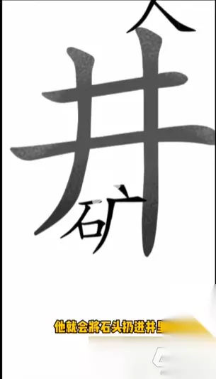 3、把下面的【石】放到上面的【人】头上,他就会把【石】往下扔到【广】左边,组成【矿】就通关了,如下图所示。