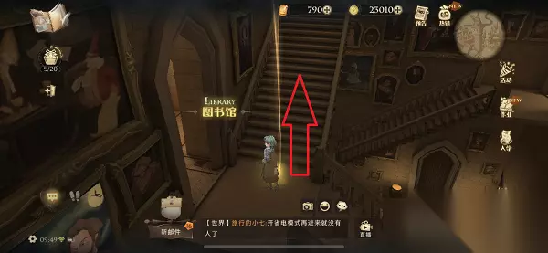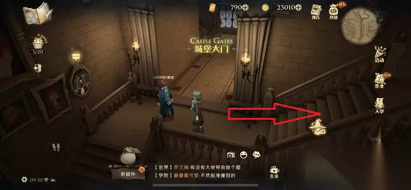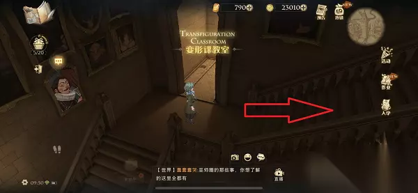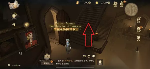 4、到达黑魔法防御课教室之后,沿前方的楼梯往上走。