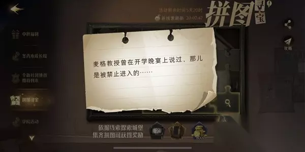 哈利波特魔法觉醒第二期拼图寻宝活动已经开启,每天都会有两到三个线索,今天的第3个线索是麦格教授曾在开学晚宴上说过,那儿是被禁止进入的......想知道拼图位置的小伙伴们一起来看看吧。