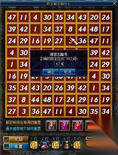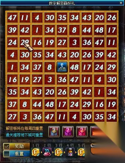 数字解密活动规则非常简单,活动以一周为期,优先猜出密码盘中间数字,然后通过开启数字密码箱点亮8行或8列数字即可拿全奖励。