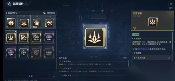 插件2号位:推荐【川流不息】,这个天赋可以大幅提升,我们开火期间,充能效率,且999不需要换弹可以吃满,该配件的属性。