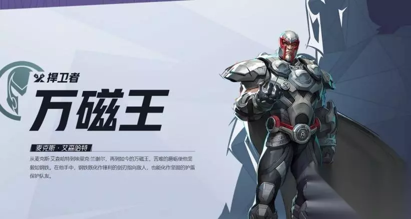 在漫威争锋这款游戏中,万磁王是一个英雄角色,定位为【捍卫者】。 他的能力是能够控制磁场,使钢铁化作剑刃指向敌人或化作护盾保护队友。 万磁王经历了二战的残酷和人类对变种人的打击,因此极度憎恨人类,并与X战警、复仇者联盟等超级英雄团队为敌。