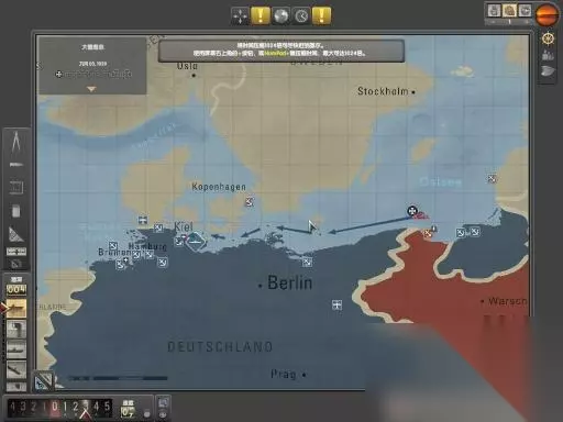最 后返回海军基地,基尔港。 按M键或者右上角的海图或者指挥舱桌面上的海图。 同样连接处航行路线,可以多次点击路线,避开陆地海道。 滚轮可以放大和缩小海图。 右上角有时间压缩倍于。可以压缩时间速度。最后到了港口后在右上角有港口的图标,点击选第二项就能结束巡航。