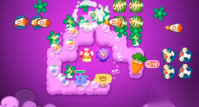 后期布局围绕鱼刺和飞机展开,它们的高伤害是通关保障。在道路拐角处多放几个汽油瓶,配合冰冻星星的减速效果能形成完美火力网。如果觉得输出不够,可以在怪物行进路线后半段补充魔法球或火箭炮塔。记住随时暂停游戏调整炮塔位置,这种动态调整能有效防止漏怪。优先解决血量厚的敌人。障碍物全清会提供额外金币,合理利用这些资源升级核心炮塔。最后阶段如果压力大,可以卖掉边缘炮塔集中强化主力输出,保住萝卜才是首要目标。