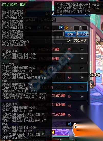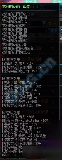 推荐异界套二: 怒放的花雨 三件套 [双重斩]攻击力+15% [旋转突袭]冷却时间-20%,攻击力+15% 六件套 [屠杀之镰]旋转次数+1,冷却时间-30%,攻击力+15%,攻击范围+10% [旋转突袭]旋转次数+1,攻击力+10%,前进距离+10% 九件套 [断头台]攻击力+30%,施放后无敌时间+50% [屠杀之镰]攻击力+40%,攻击范围+20%,冷却时间-20%,无色小晶块消耗量+1 [旋转突袭]旋转次数+1,冷却时间-10%,攻击力+15%,按前进键时前近距离+10%