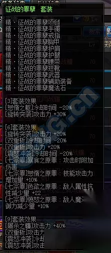 推荐异界套一: 征战的罪孽 三件套 [怠惰之躯]冷却时间-20% [旋转突袭]攻击力+30% 六件套 [旋转突袭]攻击力+20% [双重斩]冷却时间-20%,攻击力+20% [震怒冲袭]冷却时间-20% [七宗罪]暴食之原罪:攻击时附加伤害 [七宗罪]怠惰之原罪:技能攻击力增加量+10% [七宗罪]色欲之原罪:敌人属性抗性减少量+22 [七宗罪]愤怒之原罪:敌人魔法防御力减少量+10% 九件套 [屠杀之镰]攻击力+40% [双重斩]攻击力+30% [震怒冲袭]冷却时间-25%,攻击力+40% 这套做6件BUFF换装用