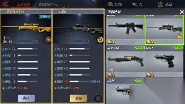 如图,黄金AWM-A和AWM相比,前者在主弹夹数上碾压后者(续航效果更强),其他数据保持平衡。不过,从深层次而言,使用黄金AWM-A作战升级和金币积累速度更快,也能更好的提升底蕴。 黄金AWM-A VS AWM-天龙