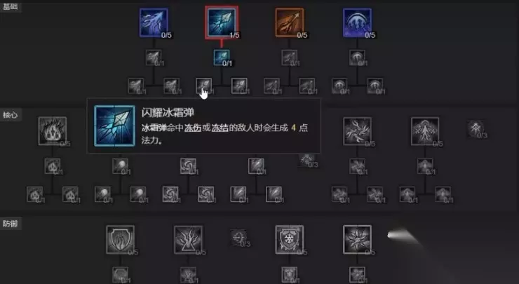 4级的时候可以点火球术,5级的时候点上面提到的过闪耀冰霜弹恢复法力,6~7级继续点火球。8级的时候分别点出传送术、寒冰甲、冰霜新星这三个防御类的技能。冰霜新星这个技能是法师的核心技能,点出这个技能之后在11级12级的时候再点出“强化冰霜新星”和“神秘冰霜新星”。