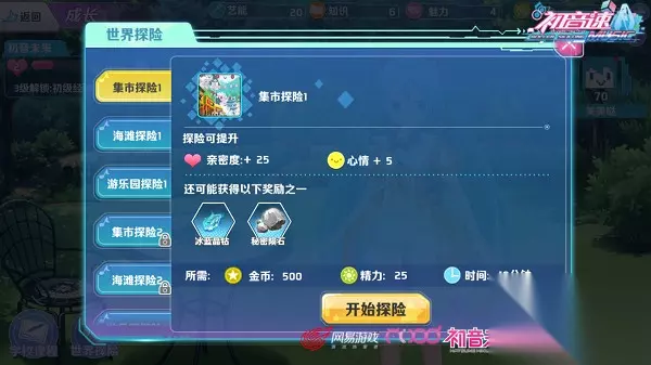提升亲密度之世界探险 在“学校课程”的旁边就是“世界探险”啦,玩家点击即可进入。玩家可以选择集市、海滩、游乐园等不同的地方进行探险。和初音未来一起探险不止可以提升亲密度和初音未来的心情,还有可能获得各种神秘奖励。奖励包括冰蓝晶钻、秘密陨石、和风秘籍等,这些都是应援制造珍贵的原料。