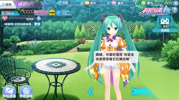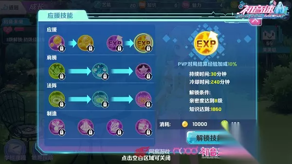 解锁神秘技能之应援技能 当初音未来的艺能、知识、魅力等属性达到一定程度,玩家可以在“应援技能”中开启各种神秘技能。包括PVP对局结算经验加成、召唤魔法阵图效果、学会制造各种饰品及装饰,各种神秘技能都等着你和初音未来一起解锁。