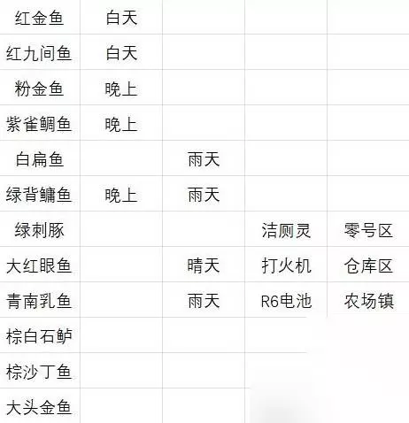 然后是个人总结的不同种类的鱼的垂钓条件,空白表示无条件,天气可以通过睡觉来刷,风暴同理。。