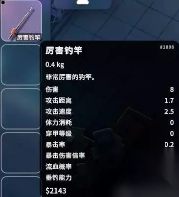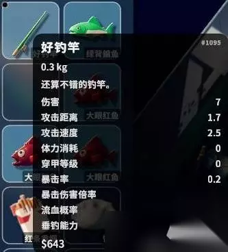 剩下的就是表格中R6电池、打火机和洁厕灵,需要对应的三种鱼时推荐使用对应的三种饵,复合的鱼饵因为泛用性太广,反而不好钓特定的鱼。 接下来是三种鱼竿的介绍,破旧鱼竿可以通过舔包获得,好钓竿可以通过厨师佛哥的任务解锁蓝图制作,厉害鱼竿可通过开战术刀具箱获得。好点的鱼竿可增加一定的垂钓能力,不过垂钓属性对钓鱼的影响不大。 厨师佛哥处也可购买鸭舌帽,增加部分垂钓运气。