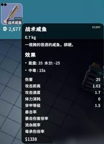 最后是获得的鱼的用途介绍。在厨师佛哥处升级生存技能可降低能量和水分消耗速度,还可以用鱼在医疗站搓各种抗属性针,在工作台搓各种属性雷。 做完佛哥的所有任务并完成生存技能所有升级,可获得一个成就和两孔近战武器战术咸鱼购买资格。