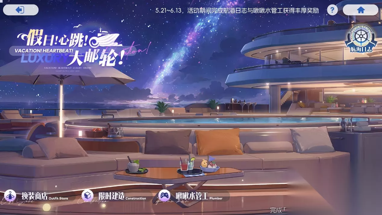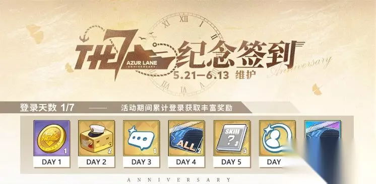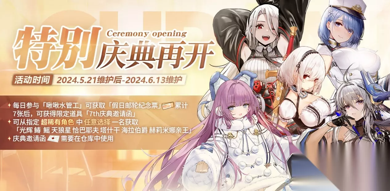 ◆邮轮探索◆ 指挥官将根据「航行日程表」完成对邮轮的探索,获取包括限定头像框、限定聊天气泡、限定纪念章在内的丰富奖励。航行日程分为度假时光、自由探索及神秘事件调查三类: 【度假时光】根据引导前往指定区域,触发相关剧情; 【自由探索】自由时间内,可前往任意未探索过的区域进行探索; 【神秘事件调查】根据引导前往指定区域,触发相关剧情,收集线索进行调查; ※完成「于启航之前」活动后可解锁探索邮轮功能; ※完成每日日程、指定区域探索、指定线索收集,均可分别获得对应的阶段奖励; ※指挥官可于「航海日志」中查阅日程内容及探索进度; ◆啾啾水管工◆ 活动期间,5月27日为止每日00:00增加一次游戏次数,总计7次,消耗游戏次数完成游戏可获得对应奖励。完成全部7次游戏,可于「特别庆典再开」活动页中领取限定道具「7th庆典邀请函」。 4.开启限时活动「特别庆典再开」,活动时间5月21日维护后~6月13日维护 活动期间,完成7日「啾啾水管工」游戏可获得限定道具「7th庆典邀请函」,用于获取指定角色中的任意一位角色。 ※本次「7th庆典邀请函」的指定角色包括:光辉、天狼星、䲠、鳐、恰巴耶夫、塔什干、海拉伯爵、赫莉米娜亲王; ※「7th庆典邀请函」需要在仓库中使用;