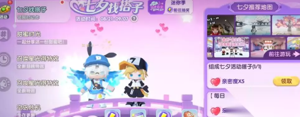 “七夕找搭子” 玩家通过登录游戏、保持在线和探索地图,可以提升与好友的亲密度。亲密度达到一定数值后,玩家可兑换专属称号”和“发射爱心”互动动作,这些特别道具非常适合在花海大厅或搭子房中拍照留念,增添节日气氛。