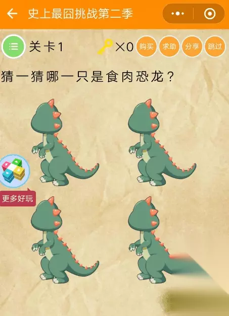 史上最囧挑战第2季第1关攻略: 猜一猜那一只是食肉恐龙? 用手点住每一只恐龙自己试试不就知道了~ 史上最囧挑战第2季第2关攻略: 你有强迫症吗? 那个刷子是没用的,直接在井盖上的白线上摩擦摩擦就去掉了~ 史上最囧挑战第2季第3关攻略: 把大象装进冰箱。 像放大图片一样把冰箱放大即可~ 史上最囧挑战第2季第4关攻略: 找出真正的蝙蝠。 将设备亮度调整到最暗即可~ 史上最囧挑战第2季第5关攻略: 算一下这等式等于几? 等于30~ 史上最囧挑战第2季第6关攻略: 请把车停在停车位上。 将中间的框框先移到题目“停车位”上,然后再把车拉上去~ 史上最囧挑战第2季第7关攻略: 先同时点住技能2和技能3变成技能4,然后再与技能1同时点住变成技能5,然后一直点技能5即可~ 史上最囧挑战第2季第8关攻略: 医生是靠什么吃饭的? 医生也是人!人当然是用嘴吃饭的(点医生的嘴即可~ 史上最囧挑战第2季第9关攻略: 小明被电脑图片吓到了,帮帮他吧 疯狂点击显示屏即可~ 史上最囧挑战第2季第10关攻略: 不能直接点选下面的字,用点上面的框框手动输入“密码”两个字~