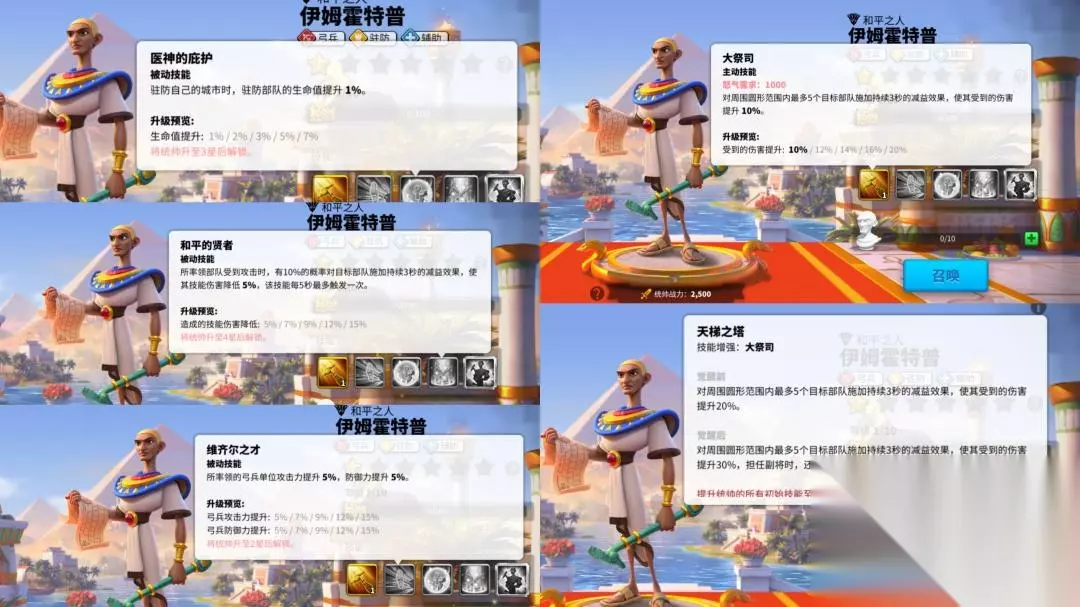 首先我们来看他的技能。 1技能:大祭司,对圆形范围内5目标施加减益效果,效果是提升目标所受到的伤害30%,且降低其150点怒气。 2技能:提升弓兵攻击和防御15% 3技能:驻防技能,生命+7% 4技能:同样是对敌方的减益效果,10%的概率降低攻击者15%技能伤害。