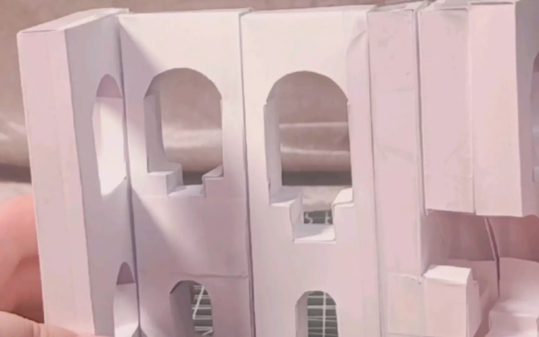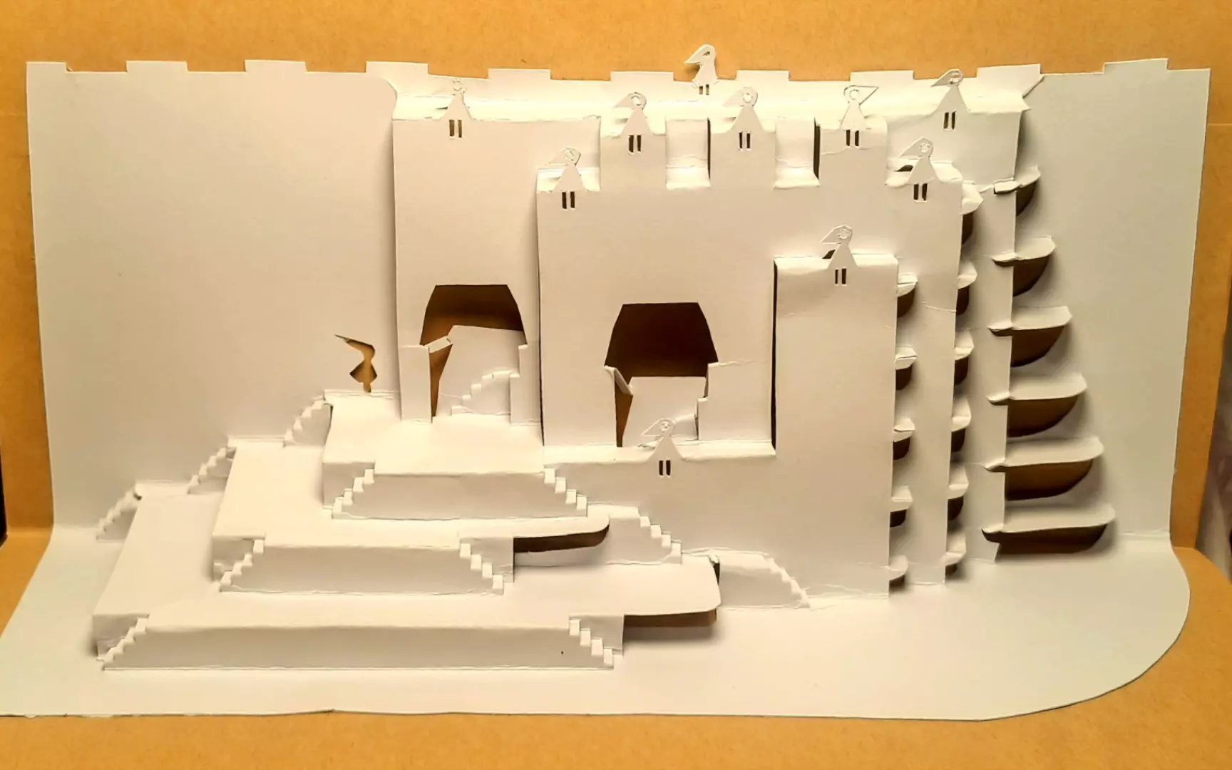 这是一款还原了游戏经典视觉错觉结构的纪念碑谷纸模,通过纸张制作出具有矛盾空间的阶梯建筑,从不同角度呈现出独特的视觉效果,展现了纸模制作的精巧与创意。