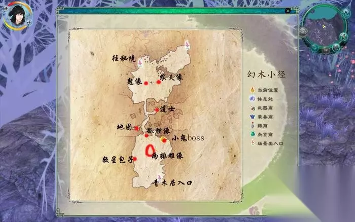 幻木小径地图 进入青木居,可以完成之前支线任务中交代的任务。 戏三怪小计脱困 从青木居出来可以直接御剑飞行回巫月神殿,到巫月神殿就被告知有三个怪人前来捣乱。姜云凡一看原来是黄山三怪,原来黄山三怪要求比武定师傅,姜云凡在小蛮的教导下,请来一贫,并让海棠夫人走见证人,以便撮合两人。 BOSS :黄山三怪 墨甲师 血量:30000 自身属性:无 弱点属性:火 酒肉童 血量:40000 自身属性:无 弱点属性:土 镜花姑 血量:20000 自身属性:无 弱点属性:风 黄山三怪并不强,注意酒肉童的普通估计就可以,因为这个时候大家仙防提升的都很高,BOSS的普通攻击反而伤害更高。酒肉童一次普通攻击大概500到800,先秒杀镜花姑,她血量最低,其次是墨甲师,他的威胁最大,最后是身法最低的酒肉童,虽然酒肉童攻击高,但是身体低,威胁不大。 追到苗疆认徒弟的黄山三怪 比武过后,立刻逃跑回蜀山,留下一贫和海棠夫人单独相处。 之后就剩下雷灵珠,四个坏蛋决定再会会上古神龙,用御剑飞行直飞霹雳荒原,神龙还在老地方,废话不多,直接开打(穹武战斗力还是那样,这个时候再和穹武打,很轻松),打赢之后,神龙寄托在雷灵珠内,和四个主角一起云游。打败神龙之后,没法直接回蜀山,需要找到一个场景进入口,那里才可以使用御剑飞行。