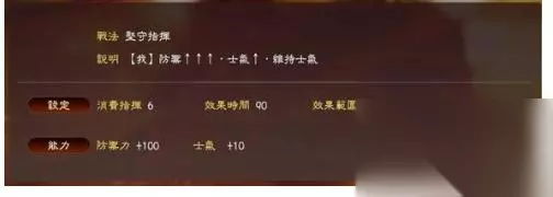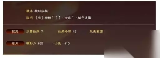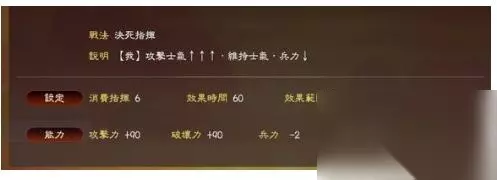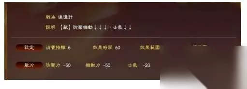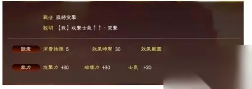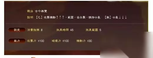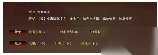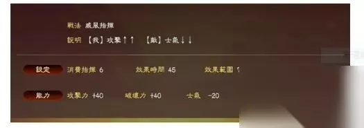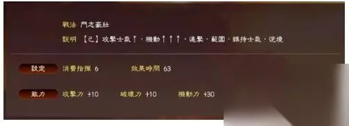 角哥的专属战法,PK版已经强化为核弹级威力。 减士气的范围在 20-60, 因此,比如,对方马超虎豹骑+高级副将, 80士气,300攻250防,角哥放一个太平的话,马超瞬间只会有 20士气 70攻55防。。