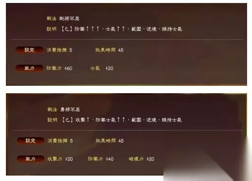 首先是这么几点,PK版和原版的基础机制,有哪些变化? 从几张截图上看,大致上是如下结论 1,基础伤害公式有小变化, 从普攻来说,原版的普攻伤害大致上是 13*己方攻击力/对方防御力X 攻城系数X 无双逆境系数X连击系数等等。 在PK版里,攻城BUG被修复,由于统定攻防,所以普攻伤害 变为 13*己方攻击力/对方防御力X 无双逆境系数X连击系数等(注意:从我脑杀的感觉来看,当对方部队防御力小于50时,在伤害公式计算时,取对方防御力为50。 防止每下普攻伤害过于爆炸 2,兵击和原版公式应该是一样的,参考豪杰系数和武力,还有普攻伤害。大致来说,比如你100统武,克制对面/全兵击/豪杰9, 兵击伤害为3倍普攻伤害。 3,士气决定攻防。 这一点修正最大。 大概是这样的,若武将出征时,有一个面板攻防 则 当武将士气崩溃时, 攻防为原本的 10% 1-25时,为原本的 30% 26-50时,为 原本的 50% 51-75时,为原本的70% 76-100时,为 原本的100% 士气大于100时,攻防变为原本面板攻防的120% 鬼神威名的 英姿,还有刚勇威名的雄姿,可以提升士气大于100时的攻防加成。 粗略来看, 比如英姿可以将 原本面板攻防的 120% 提升为 150% 然后还是一个常识性理论, 何为单体战法,何为群体战法? 不是说 大军团作战,就应该开群体战法,小规模作战,就是单体战法 单体战法的精髓在于 拷贝。 拷贝神将的能力。 因为单体战法的 范围/全方位射击,是伤害无衰减的普攻溅射的。 所以应该做的是,让单体战法蹭到 尽可能多的人来A,也就相当于,让战场上凭空产生了若干个武将,核心问题还是你的总输出,总防御增加了多少。 群体战法的问题是哪。 群体战法的问题是,即使你不开XX战法,哪些武将也是能正常普攻的。 所以,重要的不是说,你开了群体战法,你的总输出变为了多少,而是总输出,总防御增加了多少. 然后还是日常理论 连击:连击这玩意,不是说对面是脆皮,你A着就赚。对面防御力很高,连击就亏。连击的意思 永远是百分比提升攻击力,所对应的,当然是固定提升攻击力。 140%的普攻攻击力,70%的兵击,200%的对建筑伤害。这才是连击。 神奇的120%对部队伤害加成 这个在PK版应该是已经被修复了,大致就是 天下/古今/怪力无双,斗将踊跃 在敌方武力低于自己时,则输出提升20% 逆境:当自己兵力/武力 其中之1 低于对面时,则输出提升20% 顺境:这个哪些战法有不太记得了。。印象中 威风指挥,攻击指挥之类的应该有, 自己兵力多于对面时,输出提升 20%。 逆境和连击可以叠乘,比如你300攻骑兵,普攻一支对面的枪兵部队,则 逆境+连击下,可以等效理解成 你的部队攻击力有 300X1.2X1.4=504 然后我随便截几张脑杀起来比较强力的战法好了 排名就不分先后 参考我2L列出的数据,PK版 士气对攻防的影响极大强化,所以+,-士气类战法作用提升 2,玩家比起防御来说,还是倾向于攻击,不管是从时间方面,效率方面,还是从玩家选取的武将质量方面 首先是