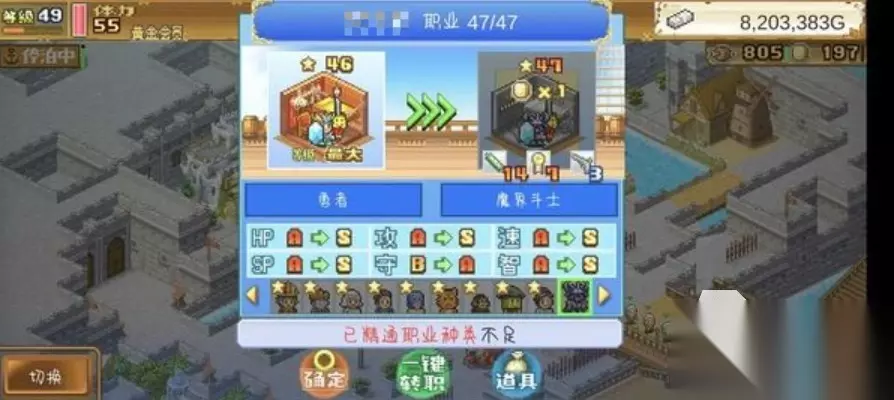 商人:转职需求需要远达到1,最高等级为15,HP值为F,SP值为F,攻击为F,防御为E,速度为F,智力为D。 铁匠:转职需求需要探达到2,最高等级为25,HP值为E,SP值为D,攻击为D,防御为D,速度为C,智力为C。 渔夫:转职需求需要工达到3,最高等级为35,HP值为D,SP值为C,攻击为D,防御为D,速度为D,智力为B。 船夫:转职需求需要船达到1,最高等级为20,HP值为E,SP值为E,攻击为E,防御为E,速度为E,智力为C。 战士:转职需求需要勇达到2和1星,最高等级为30,HP值为D,SP值为D,攻击为C,防御为D,速度为C,智力为F。