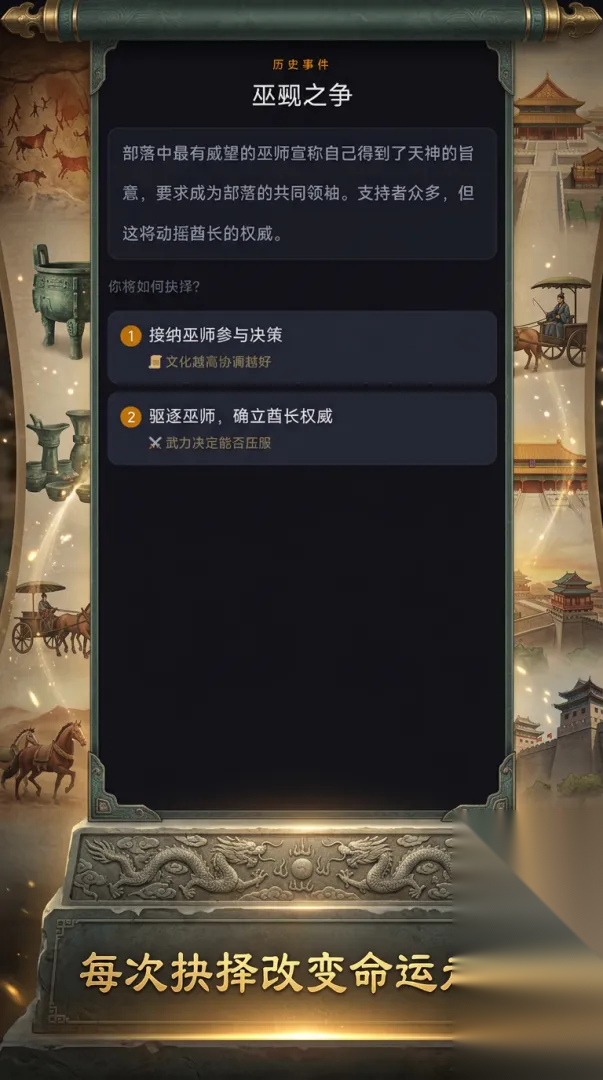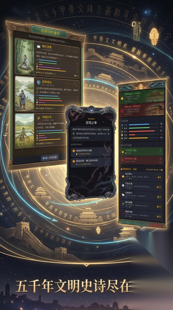 华夏五千年值不值得玩?现在就为大家来简单分析下,看看这款游戏的玩法特点和游戏剧情介绍 。 华夏五千年快速预约/下载地址(需优先下载233乐园APP): 手机扫码下载233乐园APP预约 预约订阅最新动态 优先233乐园APP下载 1、华夏五千年简要评析: 华夏五千年是一款文明生存策略文字游戏。从远古蒙昧时代开始,你将扮演一位华夏文明的领袖,带领族人穿越五千年历史长河。 【选择身份】 游戏开始时从多位候选人中选择你的身份——战族勇士、隐世贤者、大巫祝、部落酋长、农耕长老、行商首领……每位角色拥有不同的初始属性和时代特技。 【五维治国】 管理人口、粮食、武力、文化、凝聚力五大文明维度。任何一项归零都将导致文明覆灭,平衡发展才是生存之道。 【历史抉择】 面对长老制存废、巫觋之争、洪水治理等重大历史事件,你的每一个选择都会深刻影响文明走向。不同选择带来不同的属性变化和后果。 【增益减益】 决策会触发各种持续性效果——火神庇佑提升士气,商路断绝中断贸易。合理利用增益、规避减益,才能让文明长久延续。 【时代演进】 从蒙昧时代的钻木取火,到青铜时代的礼乐文明,再到铁器时代的百家争鸣……跨越多个历史时代,体验华夏文明的恢弘进程。 你能带领华夏文明走过多少年? 2、华夏五千年图片欣赏: