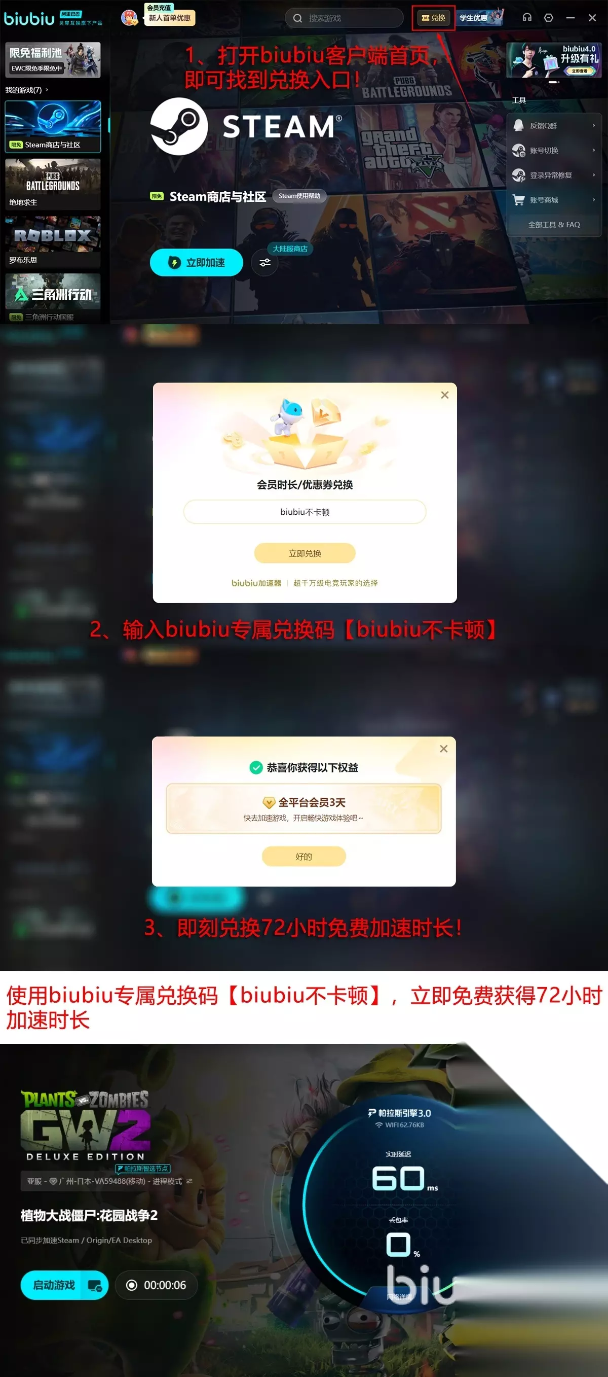 除了优秀的技术,biubiu还贴心提供了试用的福利。新注册的用户可领取整整24小时的免费使用时间,无需付费解锁全节点的使用。而在之后,想体验到更多,所有的用户都可以输【biubiu不卡顿】这一兑换号,额外的领取三天时长。