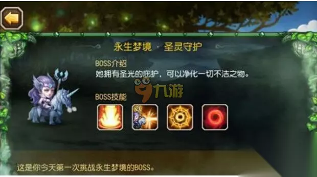 小冰冰传奇永生梦境圣灵守护BOSS技能 1.禁咒冲击,和光法动感光波一样 2.镜像奥义,随机点个免疫较高的镜像,这个免疫较高不是加双抗,而是直接加了百分比免伤,比如点了小鹿物理攻击打上去是免疫 3.净化之光,主属性和被点名目标不同的单位被秒杀 4、狂暴