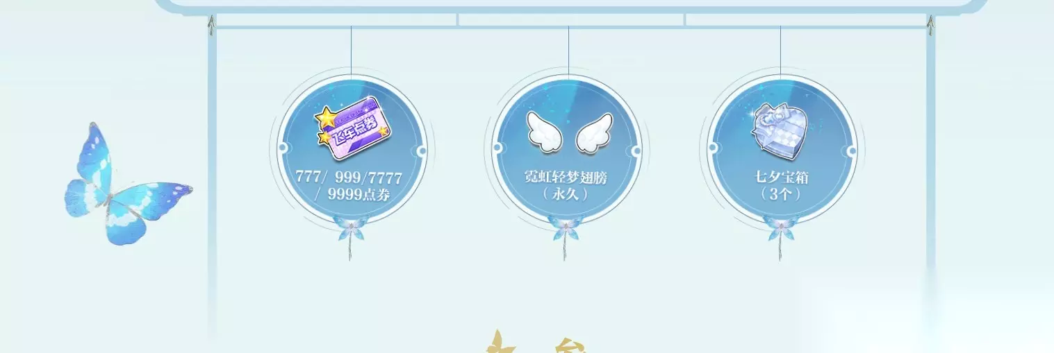 8月4日七夕佳节当日,登录即可获得丰富浪漫礼! 飞车点卷:777/999/7777/9999点券 宽虹轻梦翅膀(永久) 七夕宝箱(3个) 异性跑图送永久: