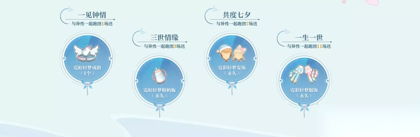8月4日-8月7日,异性一起参与比赛(酷比,舞蹈,接力模式除外),即可获得新款永久套装!谁还不是有人宠的宝宝呢~ 一见钟情:与异性一起跑图1场送霓虹轻梦戒指(1个) 三世情缘:与异性一起跑图3场送霓虹轻梦粉奶瓶(永久) 共度七夕:与异性一起跑图7场送霓彩轻梦发饰(永久) 一生一世:与异性一起跑图11场送霓彩轻梦服饰(永久) 指定赛道跑图赢: