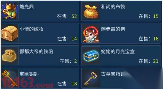 【蟾光鼎】 作用:将5颗1级橄榄石和1个蟾光鼎可以合成一颗1级丹泉石。 获得:参与活动【帮花大作战】获得【花名册】、【高级花名册】,开启有几率获得(看脸)。 【和尚的布袋】、【燕赤霞的狗】、【小倩的嫁妆】、【酆都大帝的铁函】、【姥姥的月光宝盒】 作用:以上五种分别用来装填【帮会货运】任务,可获得帮贡奖励 获得:战胜【风寨队长】可随机获得,即帮会大盗最后的BOSS。 【宝匣钥匙】 作用:开启宝石匣的钥匙~可随机获得1颗以上的宝石。 获得: 1.参加科举乡试,有几率。 2.使用如意宝箱有几率获得。 3.在易市处购买/可交易。 【古墓宝箱钥匙】 作用:在场景【古墓】中随机选一个【僵尸】即可开启,有几率获得宝匣钥匙、吴山石、绝技等珍贵物品哦~~ 获得:挖宝图