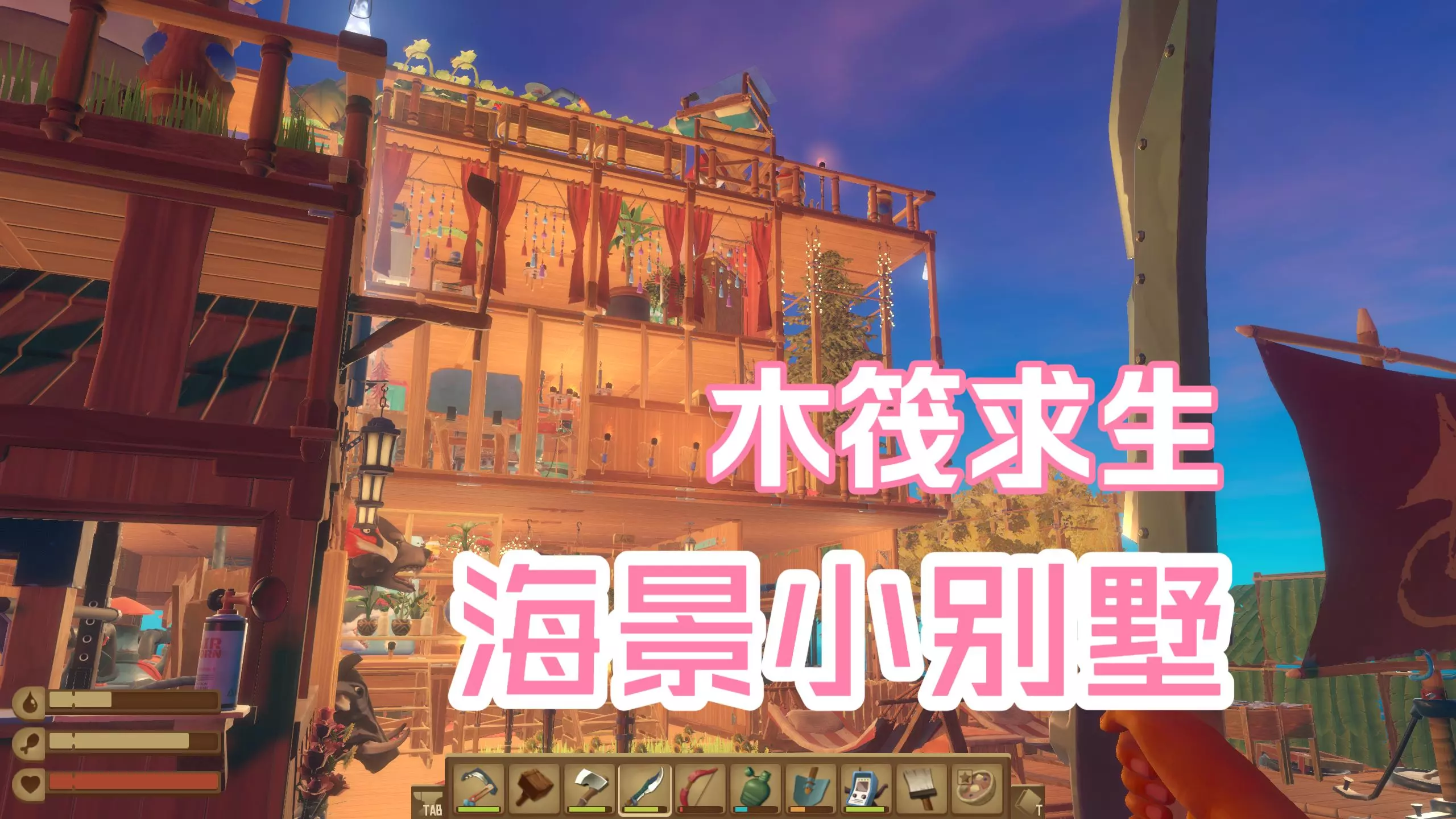 这是玩家在《木筏求生Raft》中耗时280小时搭建的海上别墅,别墅装饰精美,还有养殖区、操作区等功能区域,玩家发布该内容进行纪念。