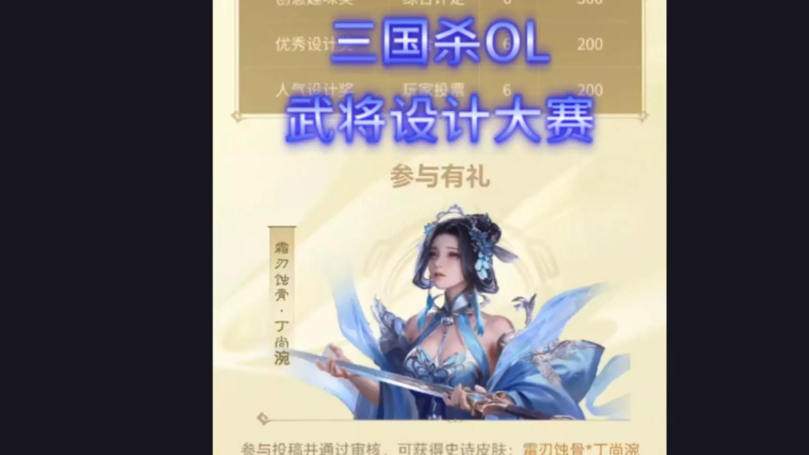 三国杀OL武将设计大赛,投稿送丁尚婉史诗皮肤、投票送16开黑魔珠