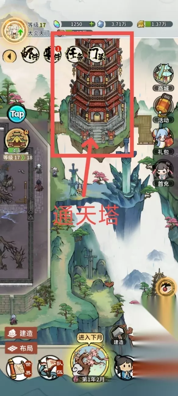 浅谈一下炼器,丹方和武器图鉴在藏书阁里看到,武器是只可以打造出图鉴里的。某些武器只能某个属性最强,比方印这个武器,只有土属性最强,不同属性武器都会有不同功效,木属性一般会带回血。炼制前都是可以预览的。 炼器等级越高,越容易炼制出好武器(废话)。材料稀有度越高,也越容易炼制出好武器。也就是说,你可以用金丹期的武器胚子和元婴期的材料炼制出金丹期的极品法器。如果炼器等级不够的话,可能会炼制失败,比方你用的元婴期胚子和材料,如果炼器等级低就会导致你炼制出一把金丹极品武器。这一点我们也可以巧妙利用一下,因为他的属性并不低,不同于一般的金丹武器,可以媲美元婴下品武器。 浅谈一下值得交好的门派,截玉派海星,残焰门很好,逆流川的神剑门,蛮荒之地的天心派...这些都是可以获取丹方的门派。还有就是看能够获取玄阶上品或玄阶极品功法的门派,其实元婴期之后的门派都值得交好。小总结:天妖古国往后的门派都值得交好。浅谈一下炼丹,优先炼制属性丹和打桩丹,最后灵石充裕的情况下炼制修为丹。 浅谈一下元婴劫和化神劫,元婴劫只要成功率大于60,大概率安全渡过,低于60会有些危险。 化神劫当然是更难的,成功率低不说,就算成功率高于80也可能失败(比方酒楼的弟子就人均雷劫神体(bushi),可以说能成功渡过是需要一定气运的,凡渡过化神劫者均是大气运加身之人。 三、关于攻略 建议务必结合缶一大佬的攻略查看。整体的剧情流程比较清晰。 开始的时候不建议一直跳过月份,当然影响也不是很大,就是收益可能少一点。天剑州,百毒谷,天妖古国等都是有城池的,可以接悬赏任务,一直跳过月份意味着接的任务少了。突破元婴的副本在醉梦灵谷,二个月刷新一次;突破化神期的副本在天妖古国,三个月刷新一次。 前期一般是缺乏天赋出众的弟子的(指六维9+),刚到源经岛可以考虑招募柳莫,六维还可以,关键是还有阵法7,可以开储物袋,降低一定难度。丹道一脉在第一天玩止步金丹期即可,大境界的打桩经验是相同的,没必要太肝。 尽快去招募金石等级高的弟子,这意味着你获取零食的速度越快。游戏中巨缺零食,无论是学习心法参悟心法,亦或者炼丹玲珑塔丹狱...都需要消耗大量零食。当然,最重要的是拍卖会,每年八月左右会有拍卖会,建议攒个两三万零食再去。 游戏新加入了通天塔玩法,位置是在这里: