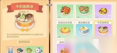 关键字:摩尔庄园牛奶鱼群汤怎么做 牛奶鱼群汤菜谱配方介绍 摩尔庄园是一款很多玩家都在玩的游戏,还是很好玩的,游戏中玩家可以自己制作食物,其中牛奶鱼群汤是游戏中比较复杂的一道菜,需要使用多种鱼类和牛奶烹饪,那么很多玩家想知道牛奶鱼群汤怎么做?下面就是摩尔庄园牛奶鱼群汤菜谱配方了,一起来看看吧! 摩尔庄园手游牛奶鱼群汤怎么做 牛奶鱼群汤=牛奶x1+鲶鱼x1+胖头鱼x1+桂花鱼x1(中火)