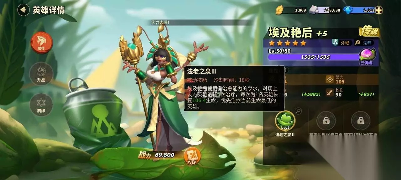 不少玩家在游戏内,相信都想知道蚁族崛起黑棘蚁埃及艳后强吗,毕竟不少大佬都想要获取该角色。本期就给大家带来埃及艳后实战攻略,还不知道的小伙伴们,下面一起来看看吧。 ——————【技能解析】—————— 游戏内的埃及艳后是目前传说级角色当中的奶妈,要知道目前的奶妈全游戏内也只有两位,其中一位还是四星级别的。埃及艳后的大招可以给队友恢复8次血量,最为关键的是回血量高并且无视距离,意味着可以放置在后面进行不断治疗。 而且根据实战当中的表现来看,这个8次回血是分别给不同角色,主要看哪一个角色血量低就给其回血,总的来说技能强度还是相当不错的。 同时其觉醒技能尼罗河的恩赐,可以加盾以及解控。让我们那些输出极高但是坦度很低的英雄有了上场的机会,毕竟有了埃及艳后阵容的坦克基本上可以当作是提升50%左右。而且话可以搭配被动技能,提升队友的攻击力以及自身的治疗量,算是现版本最佳的辅助。 由于目前游戏的大多数角色都是输出为主,所以个人建议大家前期可以首充拿到的话,就不要错过了。毕竟游戏内后期基本上都是推出新的输出角色,辅助角色对于阵容的帮助大,而且淘汰速度也很慢,绝对数大多数玩家的最佳选择。