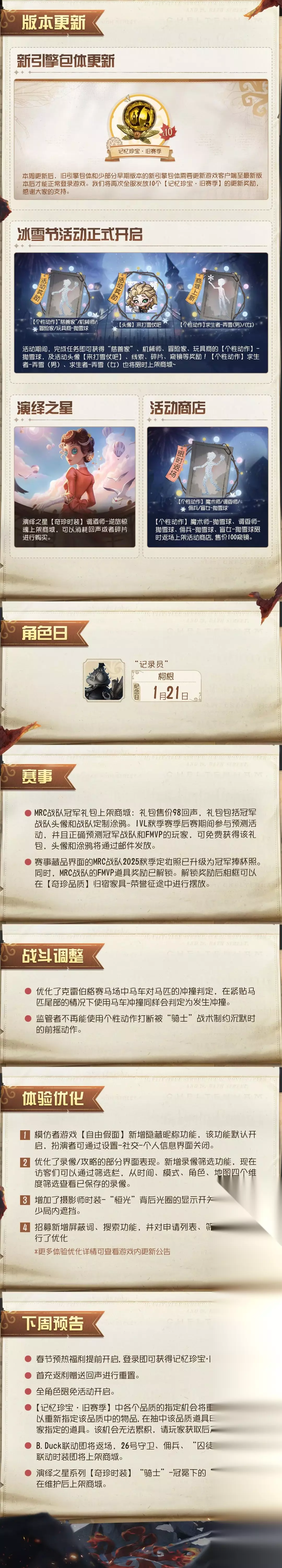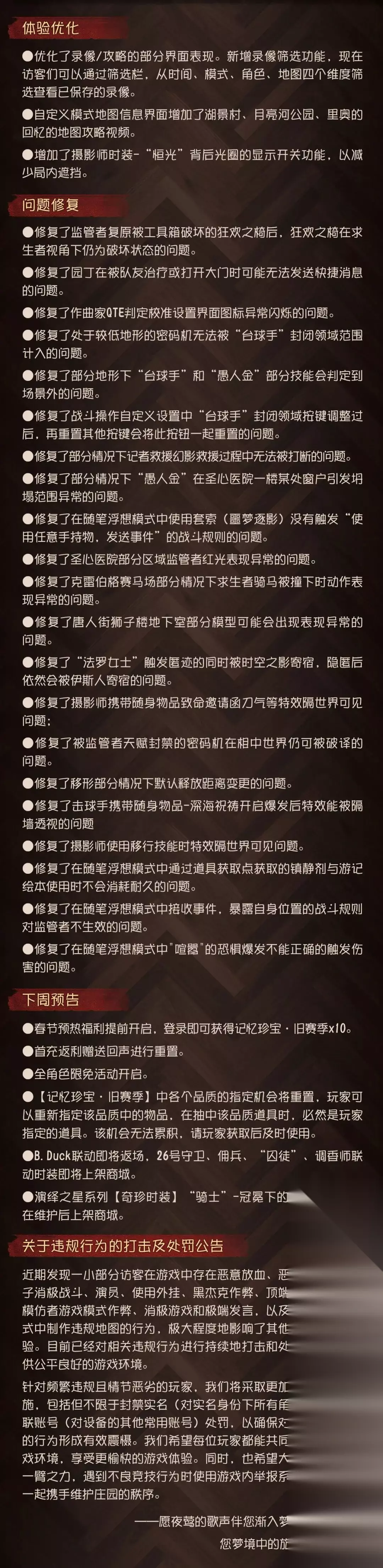 致诸位尊敬的访客: 欢迎诸位来到【第五人格】! 为保证庄园的稳定运行,【第五人格】将于周四上午07:30进行不停服维护。 本周将采用不停服维护方式。7点30分服务器进入不停服维护状态,届时各位访客依旧可以体验大部分玩法和功能,包括但不限于:匹配、自定义、活动、推理之径等,商城的物品可以正常购买; 9点(如果遇到问题该时间将会顺延)后,各位访客需关闭游戏客户端再重新登录游戏后即可获得本周更新,届时可以正常体验包括本周更新内容在内的所有玩法; 9点30分(如果遇到问题该时间将会顺延)后,若仍有访客未更新到本周内容,将进行服务器闪断式更新,届时这部分玩家会强制掉线一次,重启客户端后即可重新体验游戏。