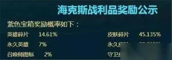 3、其他奖励 除了皮肤碎片和永久皮肤外,海克斯宝箱还会掉落一些其他奖励,下面是这些奖励的详细爆率。 英雄碎片: 14.61% 英雄碎片是玩家解锁英雄的碎片,玩家可以将多个碎片合成一个完整的英雄,或者用其兑换其他资源。 永久英雄: 7% 这个奖励为玩家解锁一个永久英雄,通过海克斯宝箱直接获得一个完整英雄。这个爆率相对较低,但对于想要某个特定英雄的玩家来说,获得的机会也是值得期待的。 召唤师图标: 2% 召唤师图标是装饰性物品,可以让玩家在游戏中更具个性化,但其掉落概率相对较低,仅为2%。 守卫皮肤: 2% 守卫皮肤是为玩家的游戏守卫提供个性化外观的一种奖励,掉落概率也为2%,同样属于装饰性奖励。