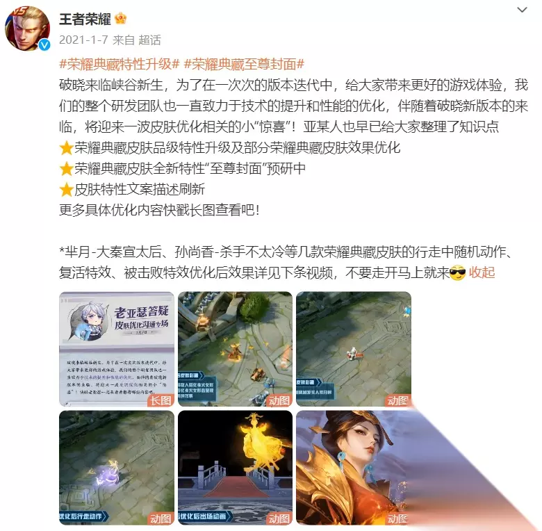 21年1月王者荣耀就宣布了这个特性升级,将对几款典藏皮肤增加至尊封面等特效,如今两年半的时间过去了,走路随机动作和被击败的特效早就有了,但至尊封面迟迟不上线。