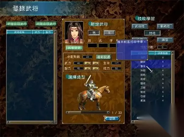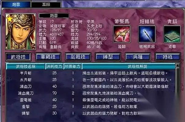 四、隐藏机制与技巧 • 武器合成:九天玄铁(编号751)为关键材料,可用于升级专属武器(如关羽炼狱魔刀需玄铁×3)。 • 秘籍指令: • 输入 addthing 830 直接获取炼狱魔刀。 • 使用 bm 技编号 可强制释放武将技(如郭嘉的“鬼谋”技编号为207)。 • 多周目差异:二周目后隐藏武将出现概率提升20%,且部分角色(如诸葛亮)需通过“三顾茅庐”历史事件解锁。