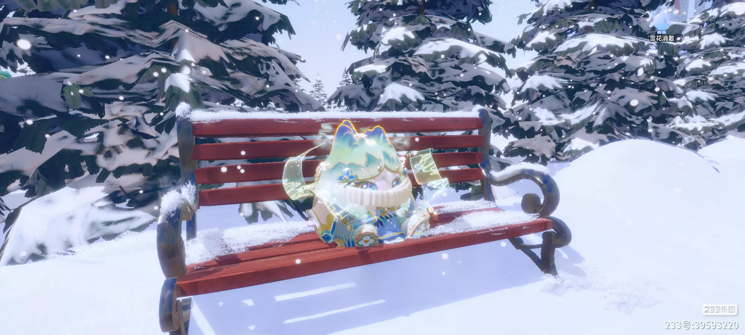 小岛旁有松树林,里面有一个被薄雪覆盖的红色长椅,跟蛋搭子戴着围巾坐在椅上(有手机拍照动作的宝可以用一下,效果更佳)周围的松树都裹满了积雪,细密的雪花缓缓飘落,恰如那句“雪裹松枝玉满庭,寒阶长椅落霜轻”呐!😋