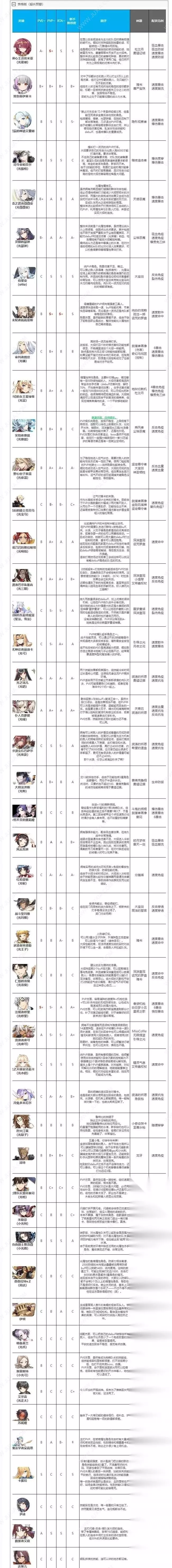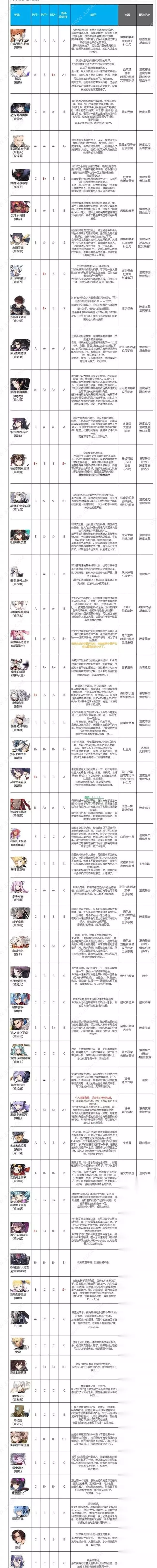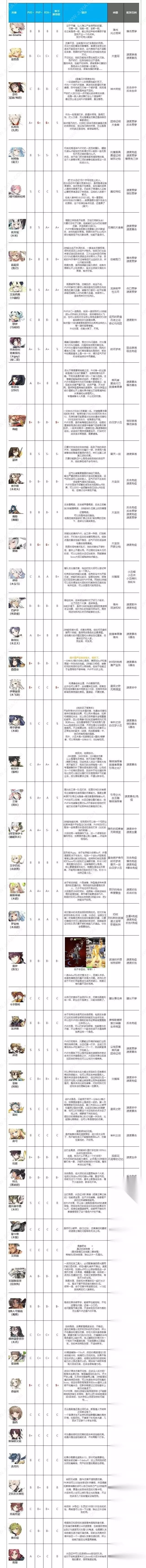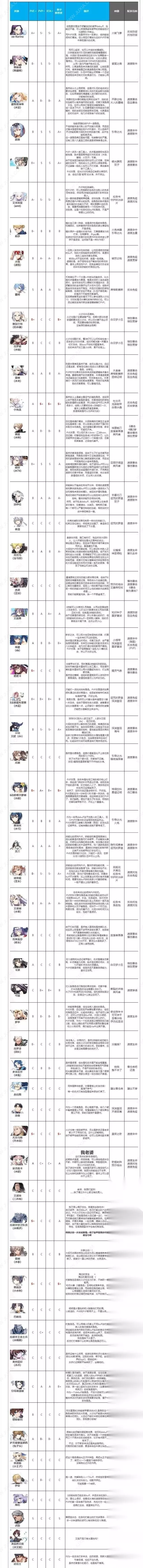 6.所有拥有转职三星角色以转职后强度来计算,角色从弱到强分为C到S+五档,其中C级为根本没法用的最弱等级,而S+的最高评级大致需要符合以下几个标准中的至少一条。 (1)可以显著降低讨伐、远征 m等核心副本的难度,或有不可替代的功能性。 (2)高速的狗粮队长,可以提高玩家获取资源的速度。 (3)在高强度PVP中成为团队核心,或拥有对抗主流角色的特殊功能性。 总结 上面便是第七史诗开服公测阶段的全角色强度排行了,我推荐大家在新手期间尽量参考本排行榜,去培养强力的角色,因为越是新手期的时候,资源越是稀缺的,这种时候,我们手里要是有一个强度很高的角色,那么就很好渡过新手期了。