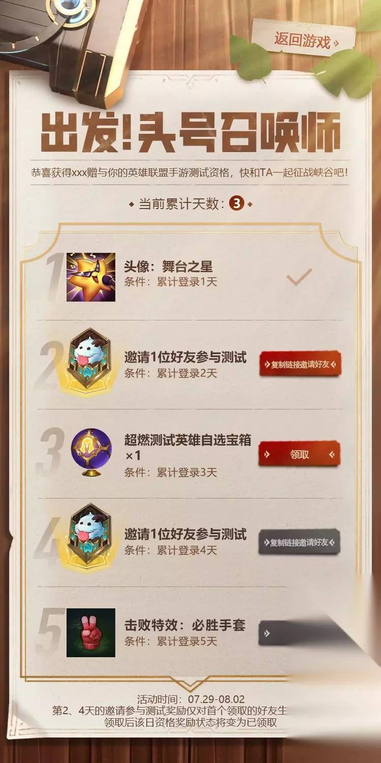 满足累计登录2天、4天的条件后,【英雄联盟手游】召唤师均可获得一个邀请名额(参与该活动最多可获取2个邀请好友名额)。 该资格仅限【英雄联盟手游】还没有超燃测试资格的召唤师获取,将自动绑定第一个领取资格的召唤师微信/QQ账号,绑定后链接失效。